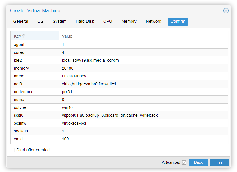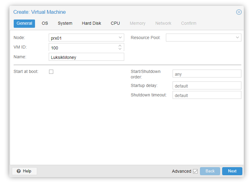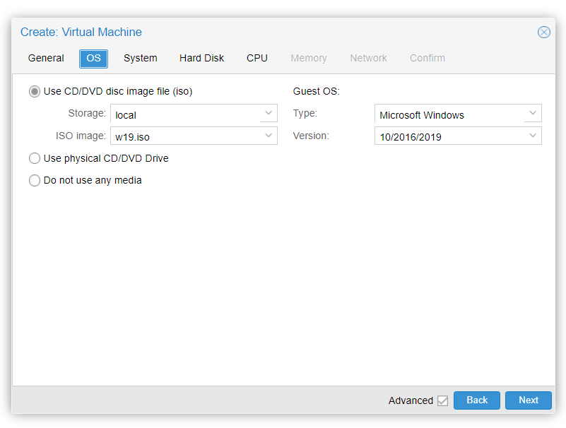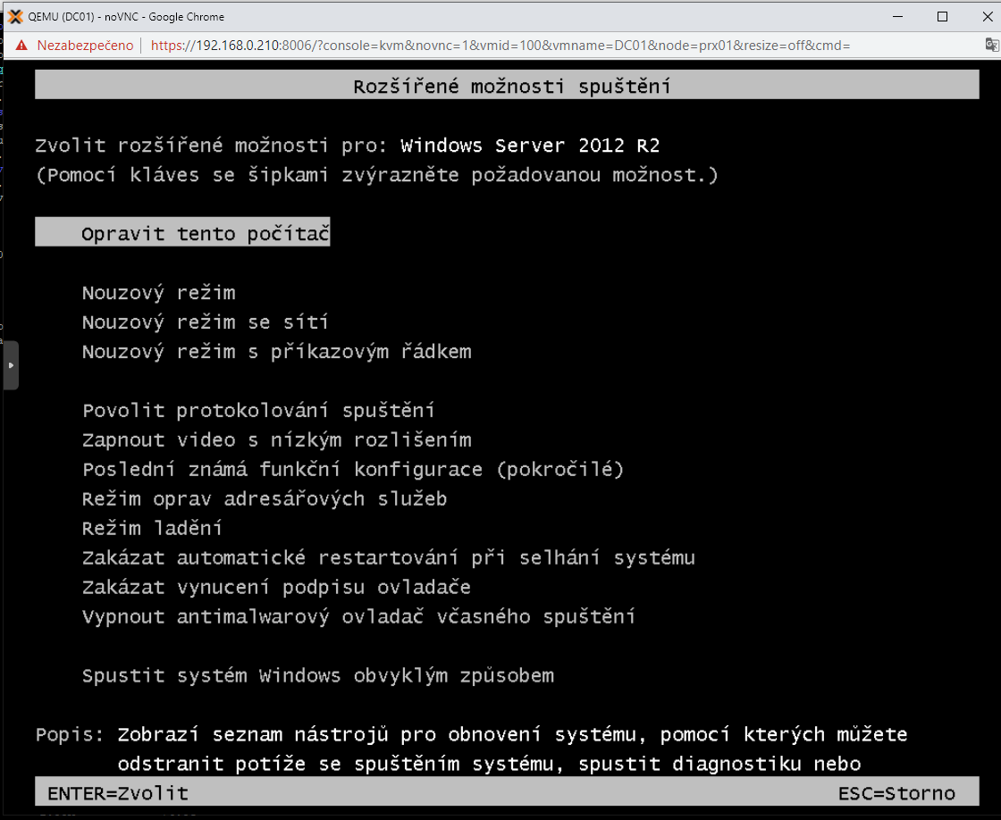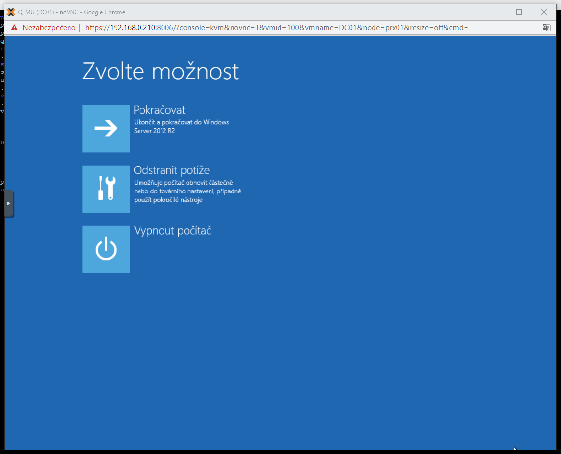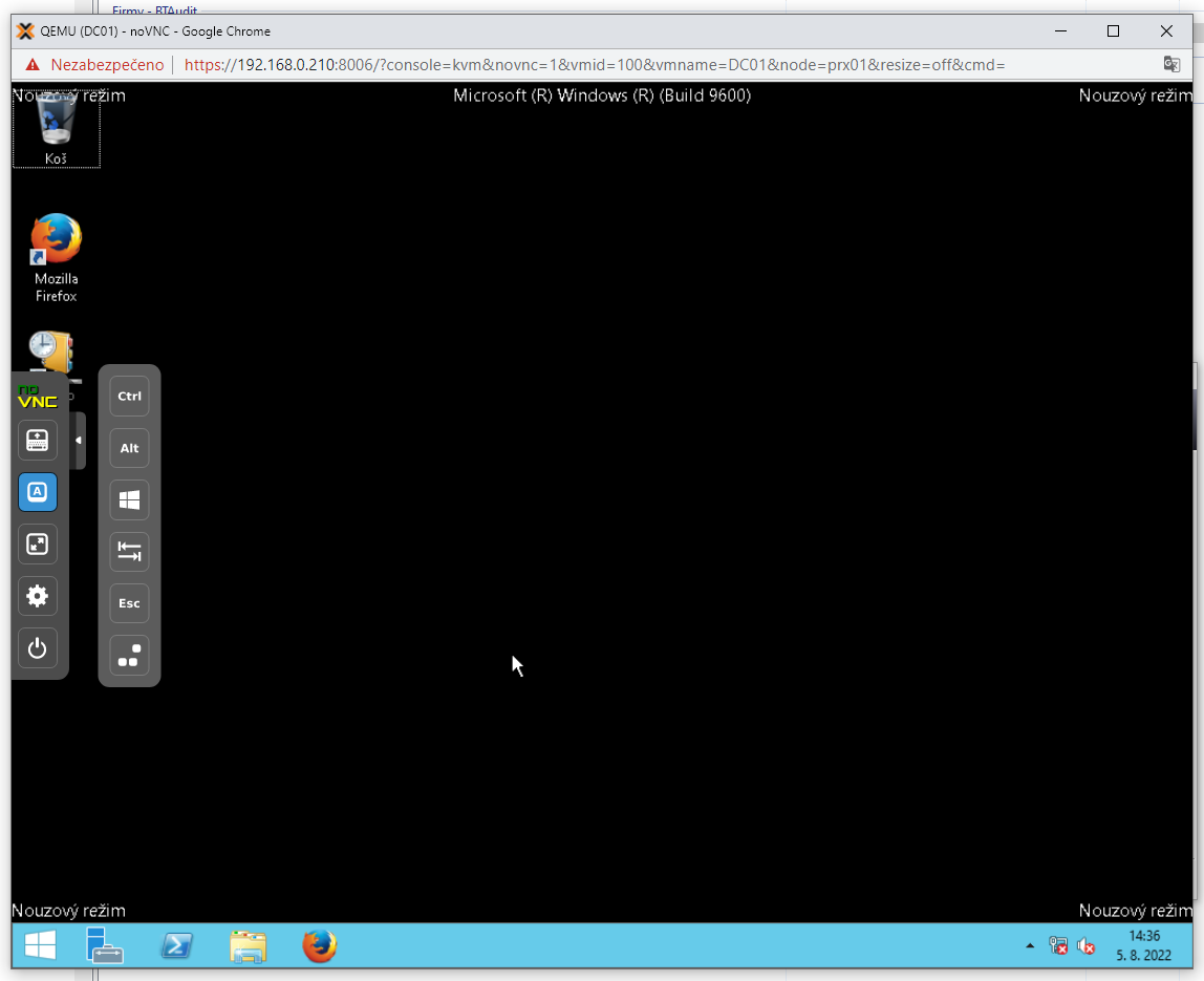 - Na PROXMOX serveru vytvořit prázdný kontejner(vytvořit nový VM) - vybrat správný OS(v tomto případě Windows 2008R2)