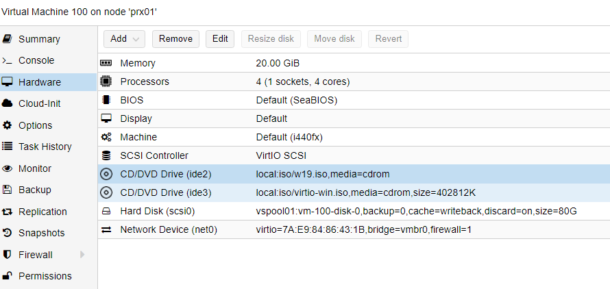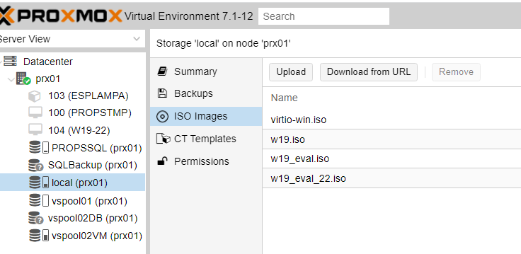 root@prx01:/etc/pve/lxc# l /var/lib/vz/template/iso/ total 16036828 -rw-r--r-- 1 root root 531554304 Apr 14 09:52 virtio-win.iso -rw-r--r-- 1 root root 5296713728 Sep 19 2019 w19_eval_22.iso -rw-r--r-- 1 root root 5296713728 Sep 19 2019 w19_eval.iso -rw-r--r-- 1 root root 5296713728 Sep 19 2019 w19.iso root@prx01:/etc/pve/lxc#