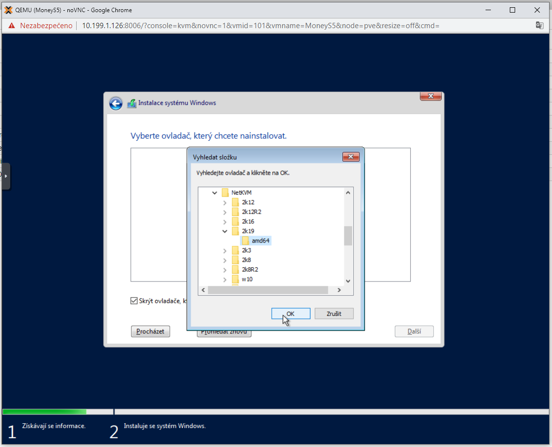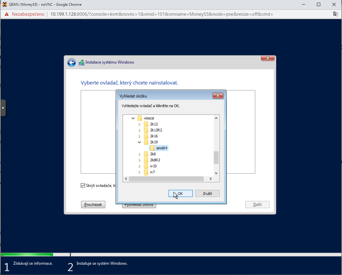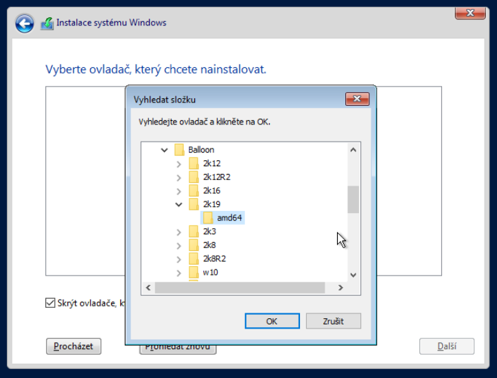 - spustit Windows a pro nový disk nahrát správný ovladač - nechat ho vyhledat v iso souboru - https://fedorapeople.org/groups/virt/virtio-win/direct-downloads/stable-virtio/virtio-win.iso
