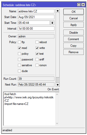 /tool fetch url=http://www.iwik.org/ipcountry/mikrotik/CZ /import file-name=CZ