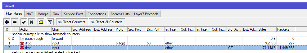 chain=input action=drop src-address-list=!CZ in-interface=ether1 log=no log-prefix=""