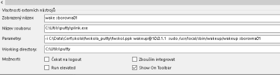 Parametry: -i C:\Data\Cert\skola\fwskola_putty\fwskol.ppk wakeup@10.0.1.1 sudo /usr/local/sbin/wakeup/wakeup sborovna01