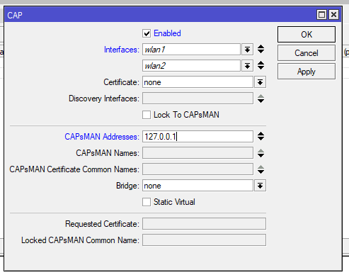 Wireless → tl. CAP nastavit CAPsMAN address na 127.0.0.1 pro obě rozhranní(wlan1, wlan2)