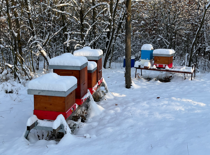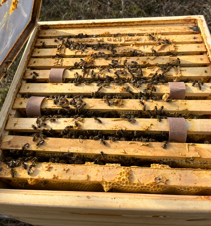 - 07.3.2025 - Kontrola včelstev, doplnění zásob, kde bylo potřeba. Ve třech krajních úlech jsem vložil „komorovačku“, slabší včelstva