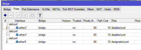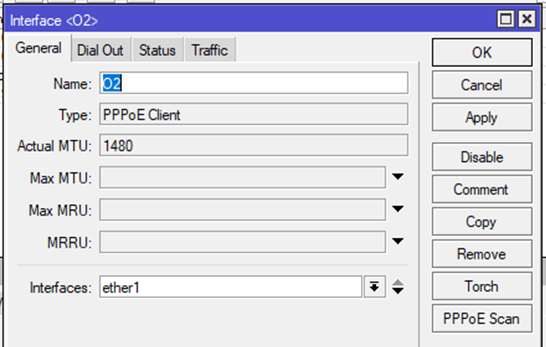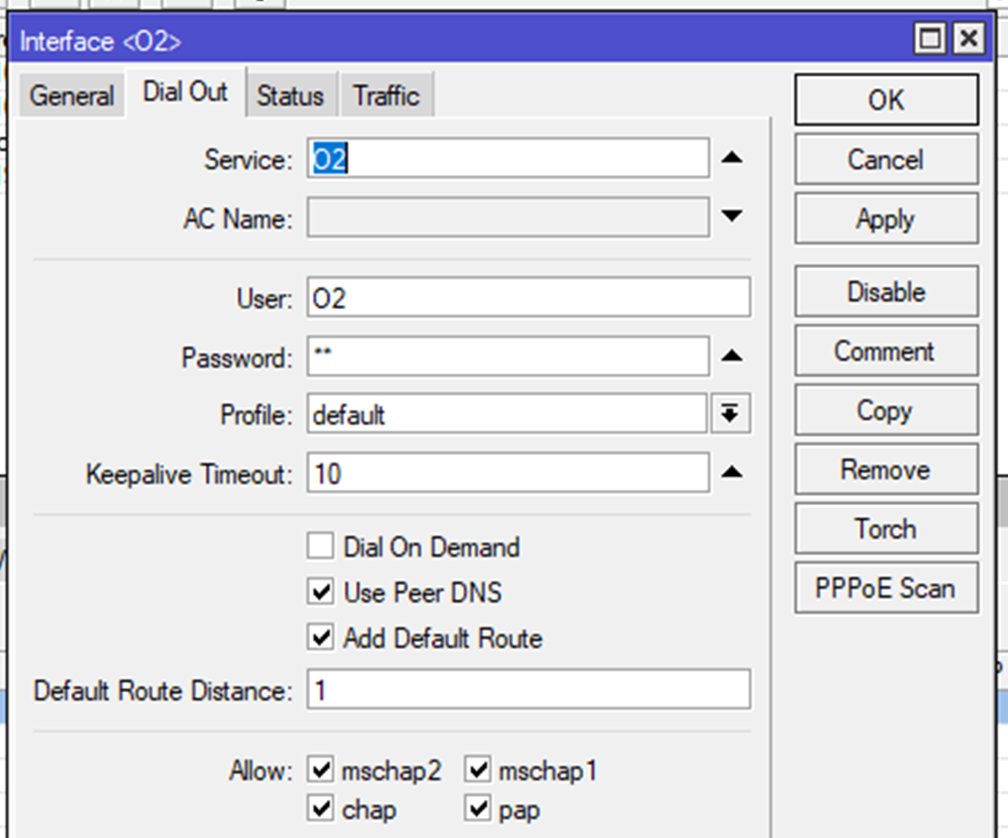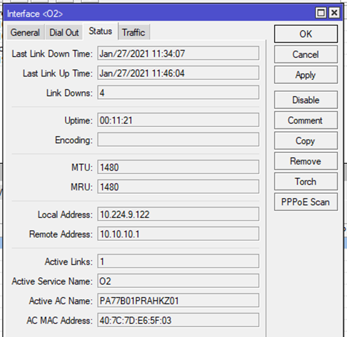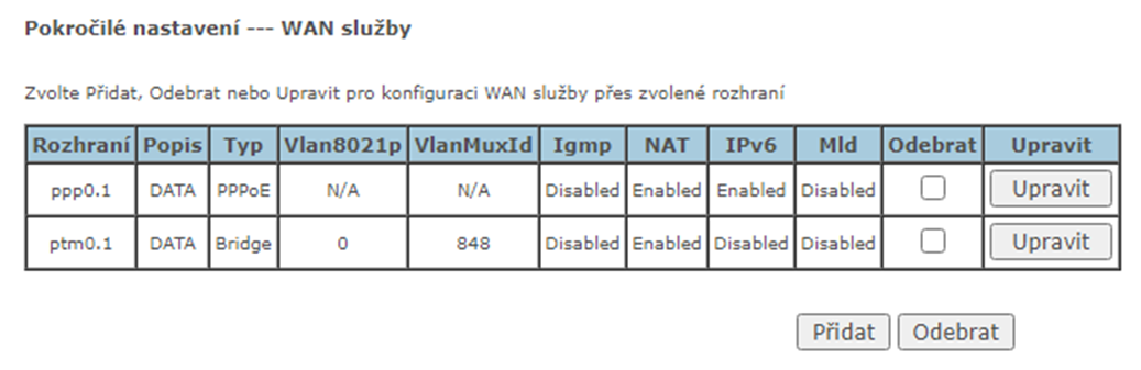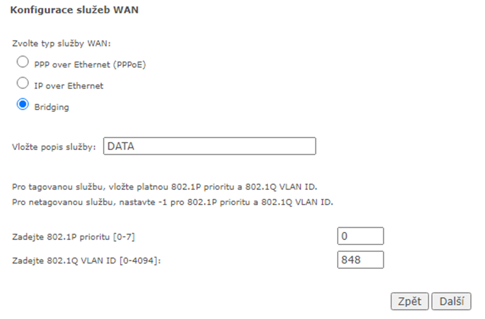 VDSL modem Zyxel VMG1312-B303B Modem je přepnutý do Bridge módu. Na Mikrotiku je vytvořené rozhraní PPP
