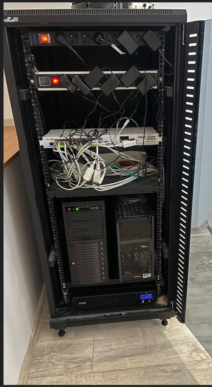 Z panelu je napájen VDSL modem Zyxel, router Mikrotik, switch Mikrotik a 2x WIFI Mikrotik - CaP.