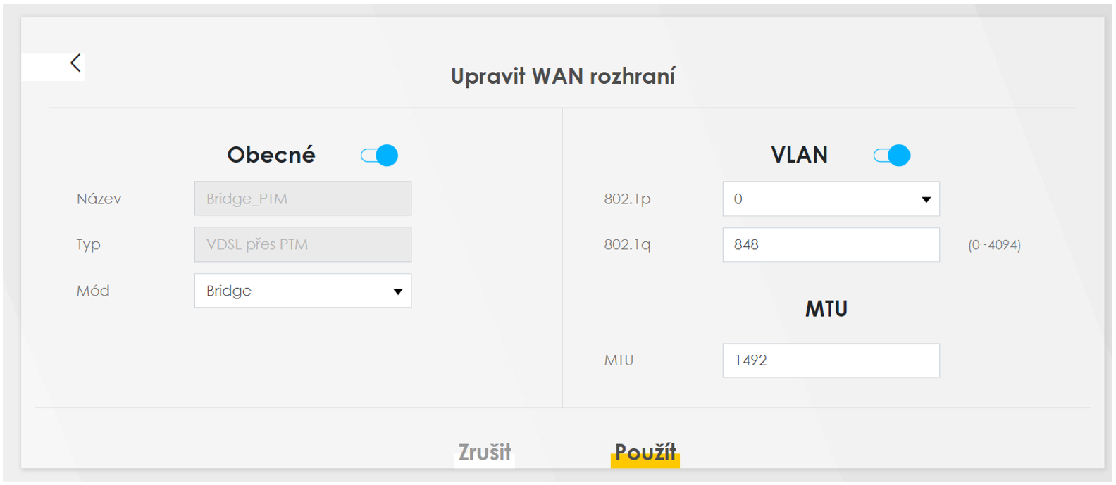 Modem je nastaven do Bridge módu. Zabezpečení a přihlášení je řešeno na Mikrotiku. Bridge móde je nastaven na modemu defaultně, stačí zapnout podporu VLAN a upravit hodnotu 802.1q na 848