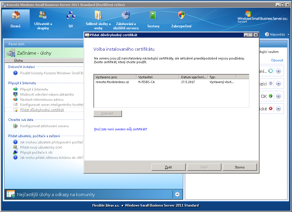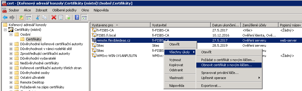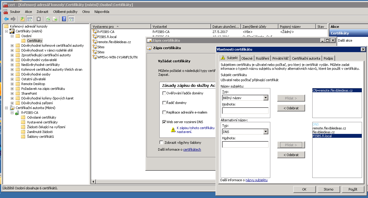 Certifikáty(místní) -> Osobní -> Certifikáty Pravým tl. myši -> Všechny úkoly - Požádat o nový certifikát Běžný název remote.flexibleideas.cz DNS remote.flexibleideas.cz flexibleideas.cz FISBS.fi.local Popis web srv remote.flexibleideas.cz