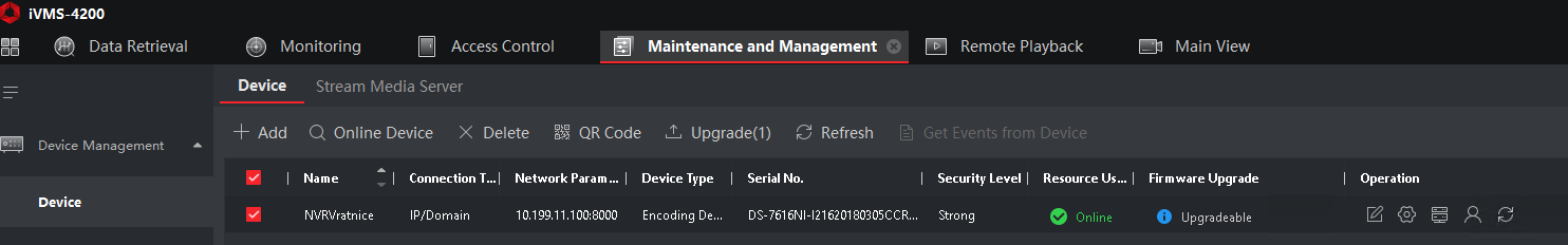 Vyberte zařízení NVRVratnice a v pravo klikněte na ikonu ozub. kola(Remote Configuration)