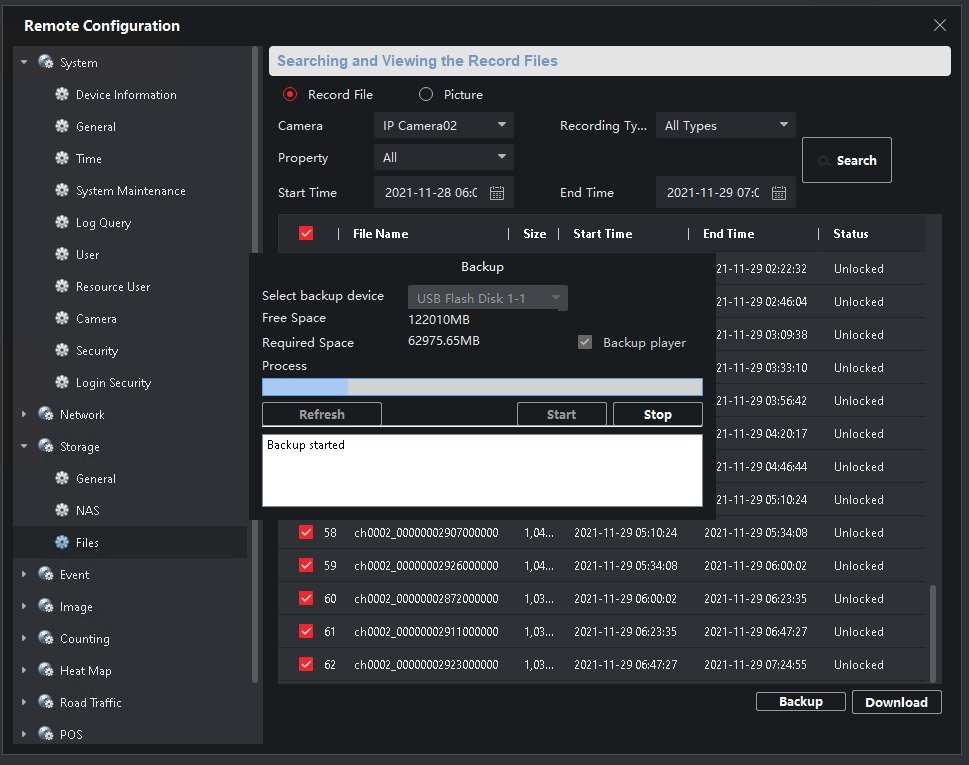 V menu nastavte konkrétní časový interval a najděte požadované video soubory tl. Search.