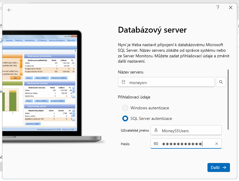 - připojení k databázi by se mělo načíst - jinak host: moneysrv, user: MoneyS5Users, SQL autentizace