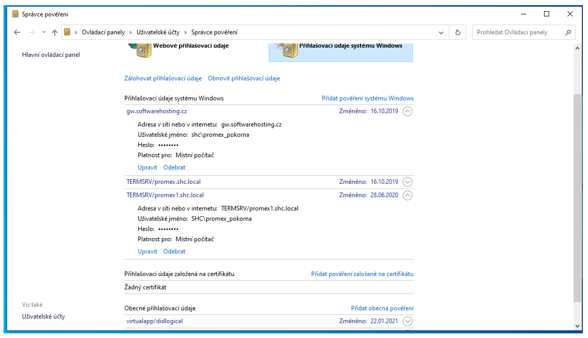 Pro uloženi přihlašovacích údajů je potřeba uložit heslo pro počítač TERMSRV/PROMEX1.SHC.LOCAL' a pro GW.SOFTWAREHOSTING.CZ''