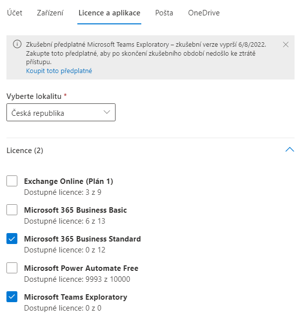 Musí být aktivní Exchange Online(Plán 1)