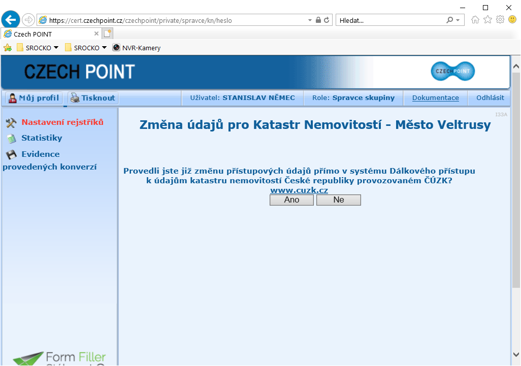 Na otázku Provedli jste již změnu přístupových údajů přímo v systému Dálkového přístupu k údajům katastru nemovitostí České republiky provozovaném ČÚZK? www.cuzk.cz vyberte možnost NE