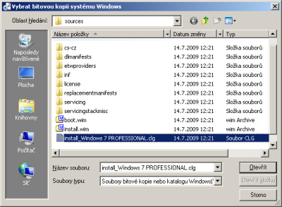 Z menu Soubor vyberte položku Vybrat bytovou kopii. Z nabídky vyberte .clg soubor(dle verze Windows např. install_Windows 7 PROFESSIONAL.clg)